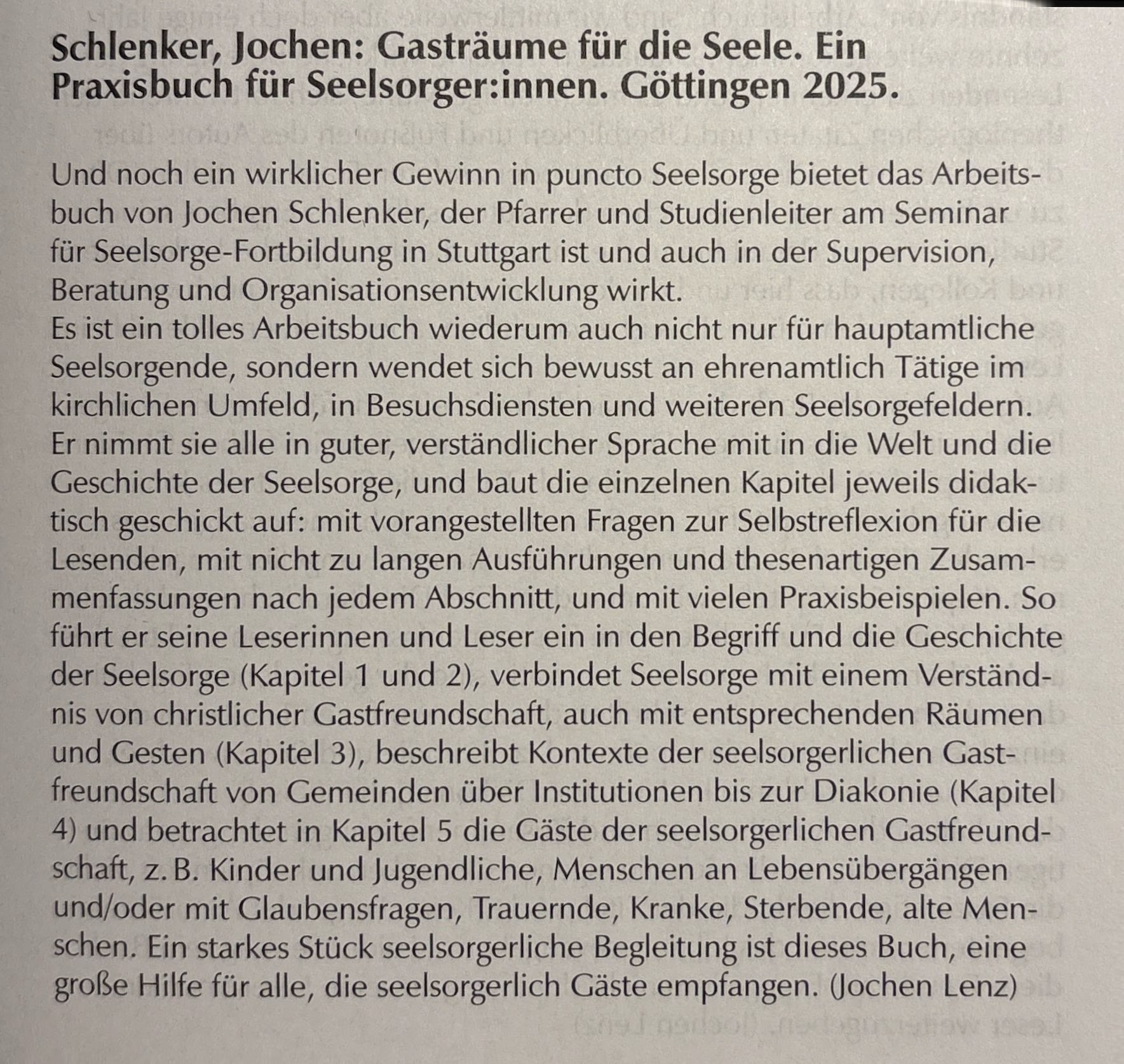 "'Ein Praxisbuch für Seelsorger:innen' ist das Buch von Jochen Schlenker, Pfarrer und Studienleiter für Seelsorge-Fortbildung in Stuttgart, überschrieben. Es richtet sich explizit an Ehrenamtliche und Nicht-Theologen, die in der Kirche und in der Diakonie in der Seelsorge arbeiten. Und dient auch als Einführung für Pfarrernund Diakone. Nach einer kurzen Definition geht es über die Einladung der Seelsorge in die einzelnen Felder. Praxisbeispiele veranschaulichen mögliche Beziehungssituationen, bei so genannten Selbstreflexionen ist die Leserin aufgefordert, sich auf die Suche nach Antworten auf die Fragen zu begeben. Ein Buch zum Nachdenken, Nachfühlen und zum Austausch." zeitzeichen, 08/2025